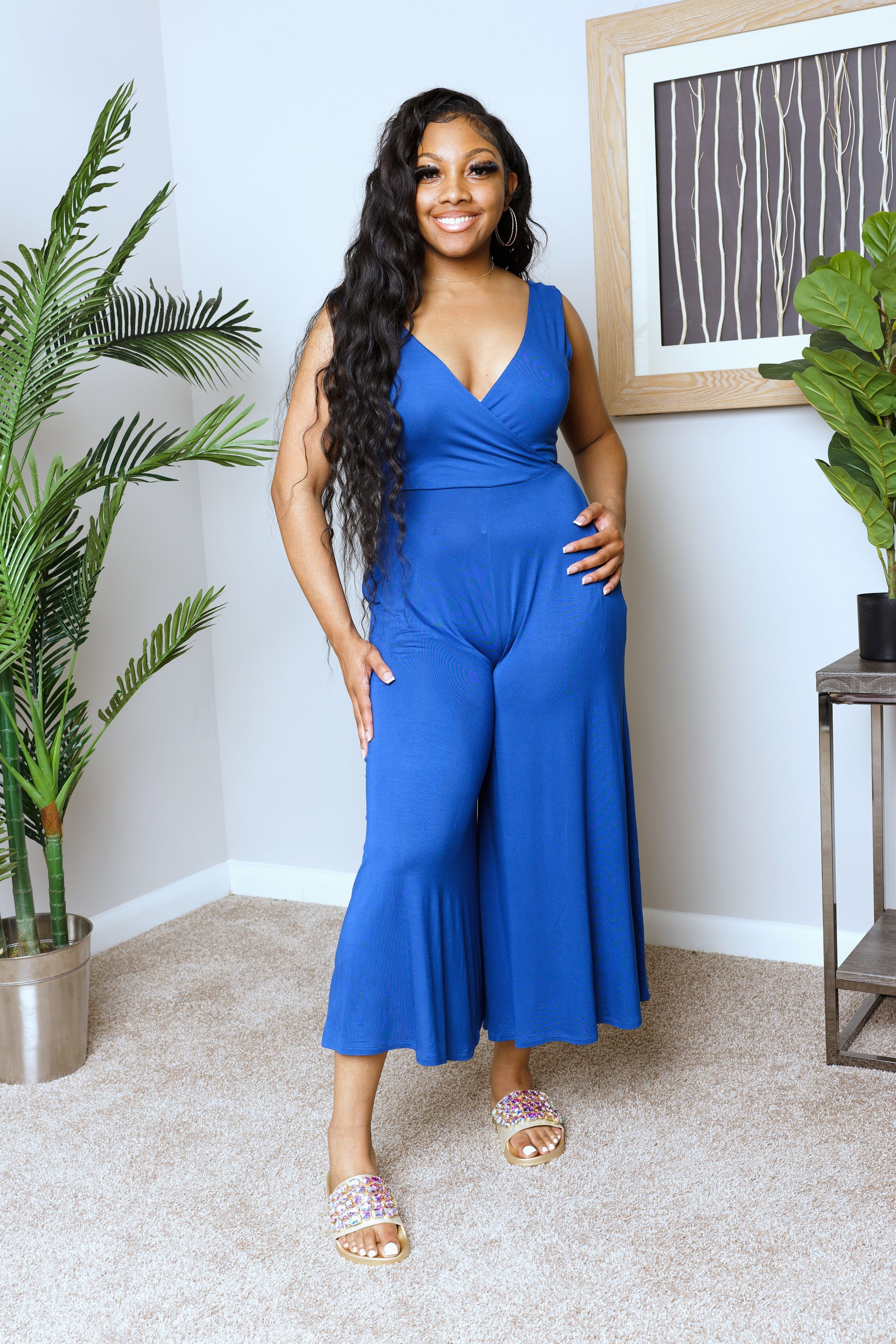 Step into style and comfort with our latest Surplice Neckline Sleeveless Jumpsuit. With its wide legs and convenient pockets, this piece is perfect for so many occasions. You can dress it up or down with a pair of our Rhinestone Slides.