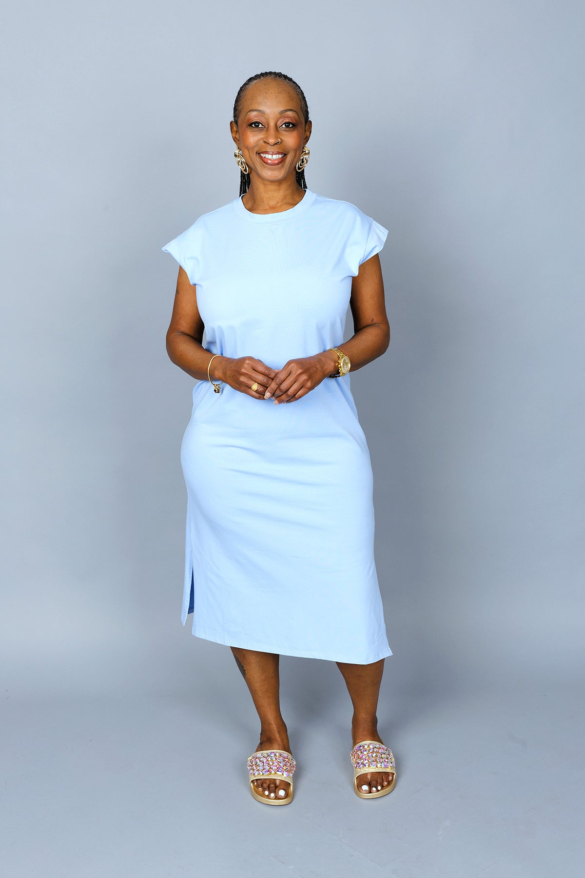 SHORT SLEEVE MIDI DRESS W/SLITS| SPRING BLUE
