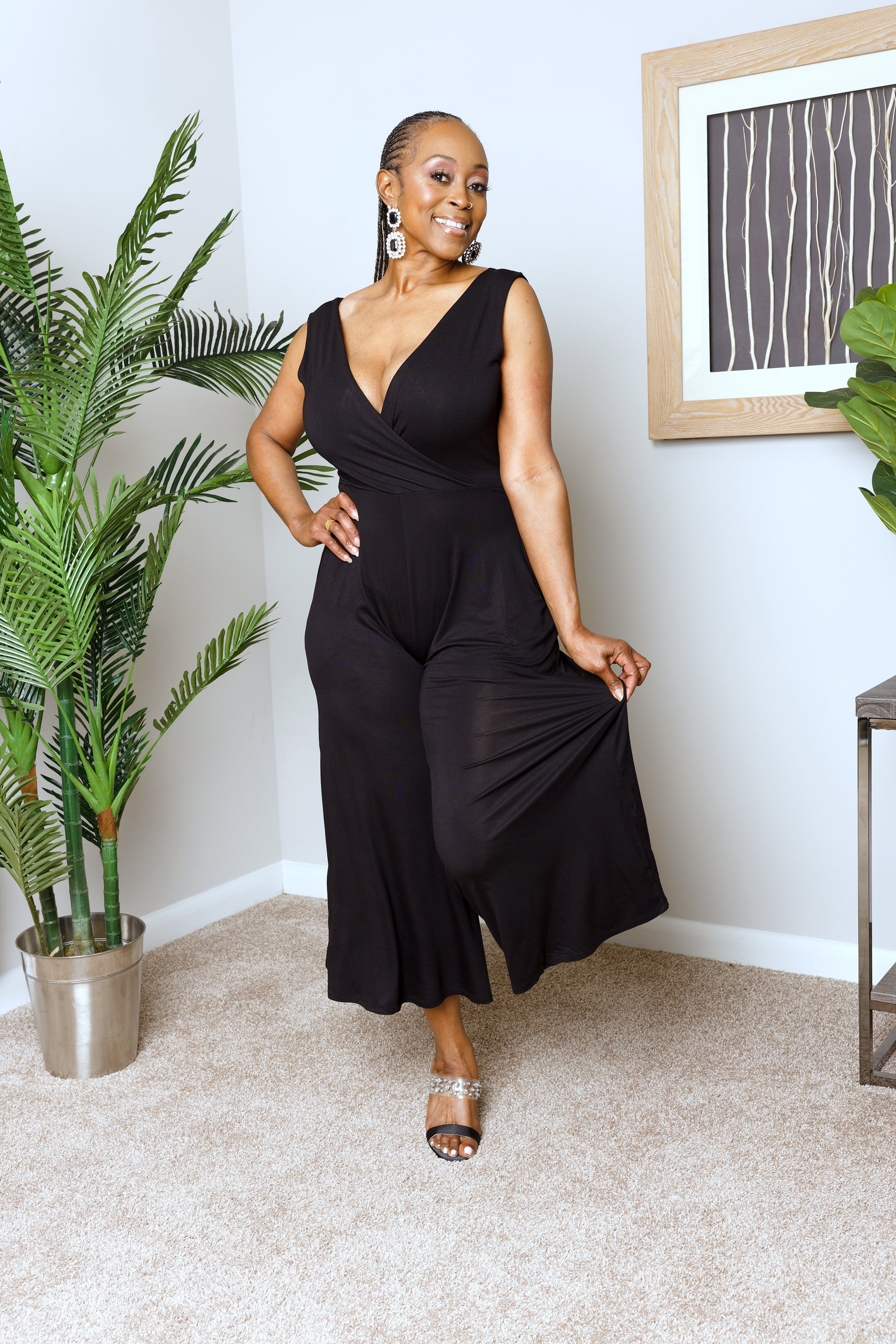 SURPLICE NECKLINE SLEEVELESS JUMPSUIT W/ POCKETS| BLACK