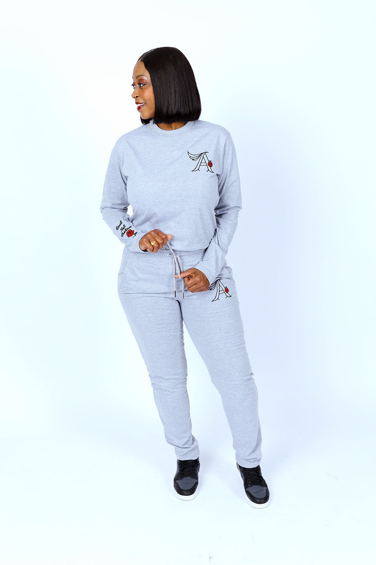 Soft, comfy and made for every season- our new custom Cotton Jersey Long Sleeve Jogger Set is designed for everyday wear in mind. Perfect to just throw on and go. Featuring elegant embroidery with our new emblem and Bent Not Broken on the sleeve because life challenges may bend us, but they will not break us! This new addition to The Ashley Collection is about standing strong, pushing forward and looking good while doing it.
