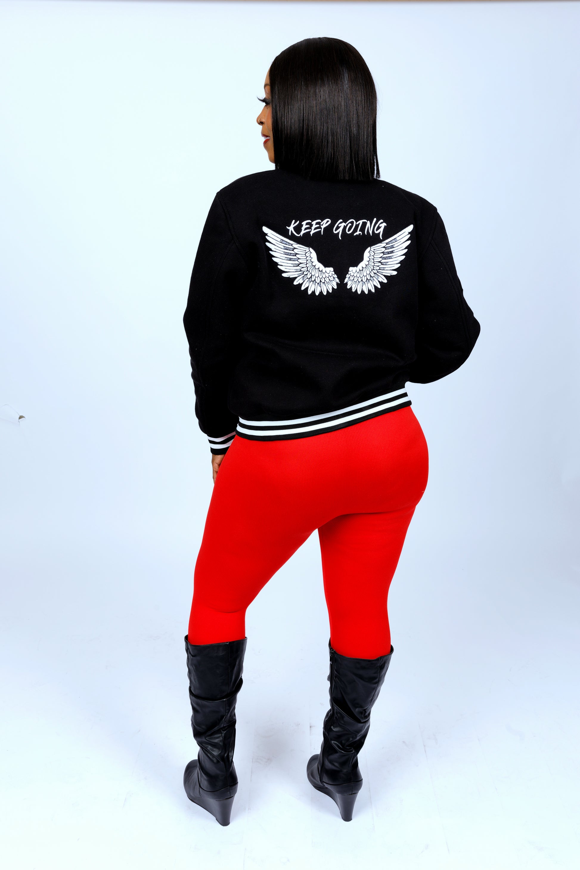 Join the team with the new Luxe Signature Varsity Jacket from The Ashley Collection—a heartfelt tribute to love, strength, and perseverance. Adorned with a ladybug, a rose, and angel wings symbolizing the angels in your life always having your back. This jacket proudly displays the uplifting message KEEP GOING. Designed to inspire and remind you that you're never alone, it's more than a jacket—it's a symbol of unity and resilience. Perfect cotton material for year round wear. Shop now and get this one of a kind.